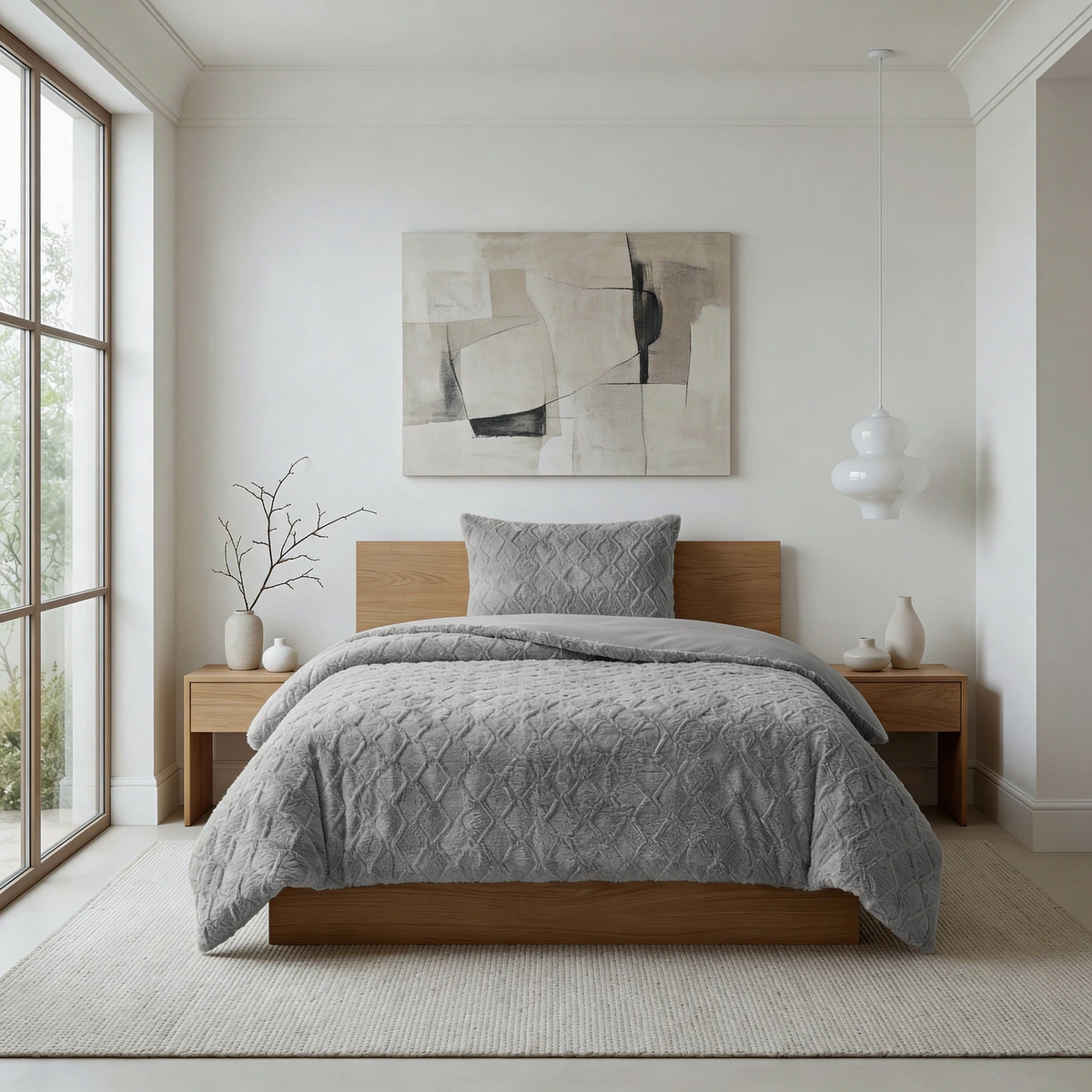 Wyrazista struktura teddy oraz staranne wykończenie sprawiają, że pościel Sleeptime Teddy sztuczne futerko Syon nadaje sypialni elegancki i modny charakter. Chłodny minimalizm i ciepły efekt wizualny tworzą harmonijną całość, która doskonale pasuje zarówno do wnętrz nowoczesnych, jak i klasycznych. To pościel, która nie tylko poprawia jakość snu, ale także stanowi element dekoracyjny sypialni.