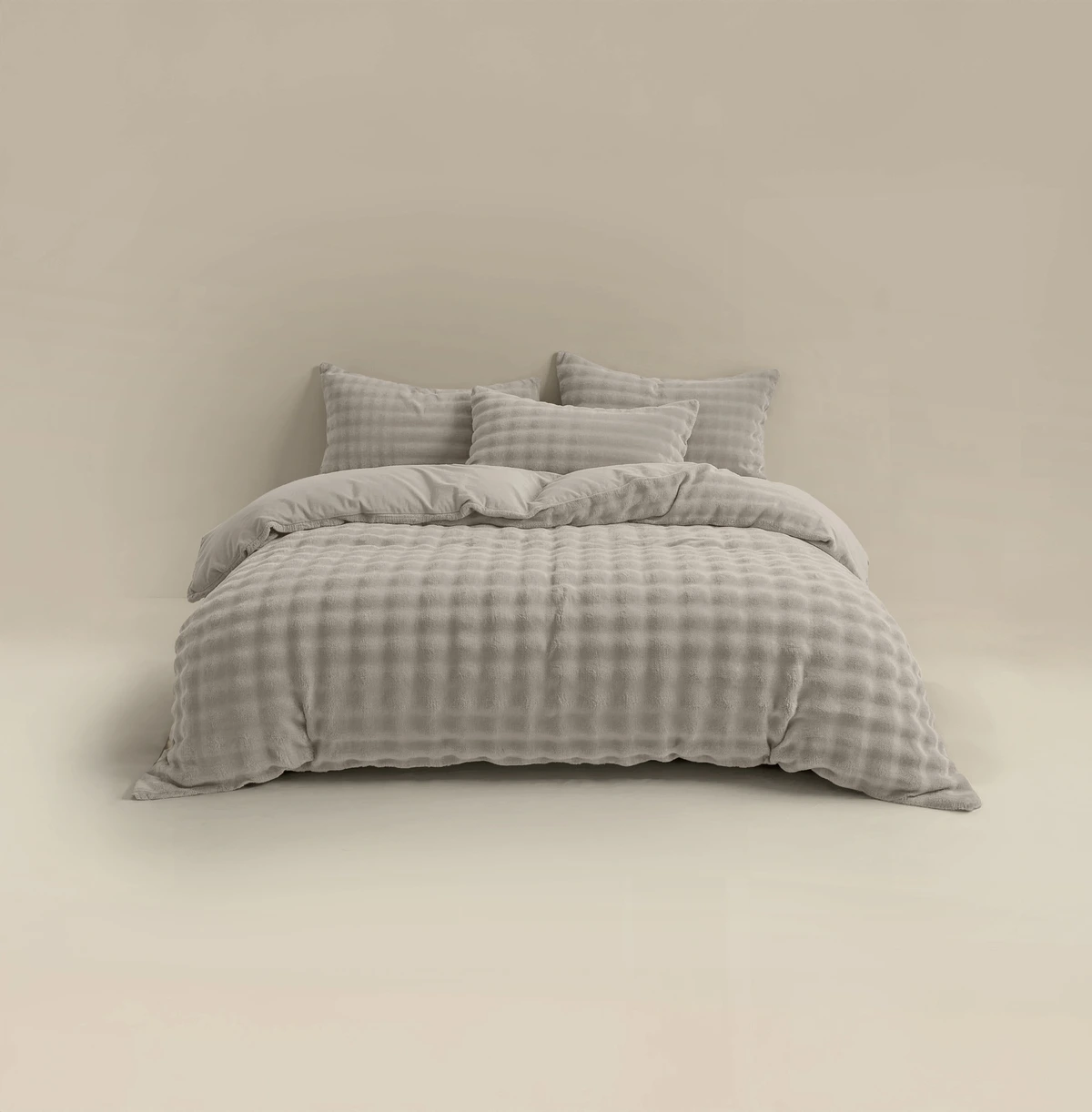 Wierzchnia strona poszwy została uszyta w 100% z pompom flanel fleece o gramaturze 280 g/m² – materiału, który natychmiast zapewnia przyjemne ciepło i aksamitne uczucie miękkości. Dzięki stylowej strukturze pomponowej całość prezentuje się nowocześnie i elegancko, nadając wnętrzu przytulny, modny charakter.