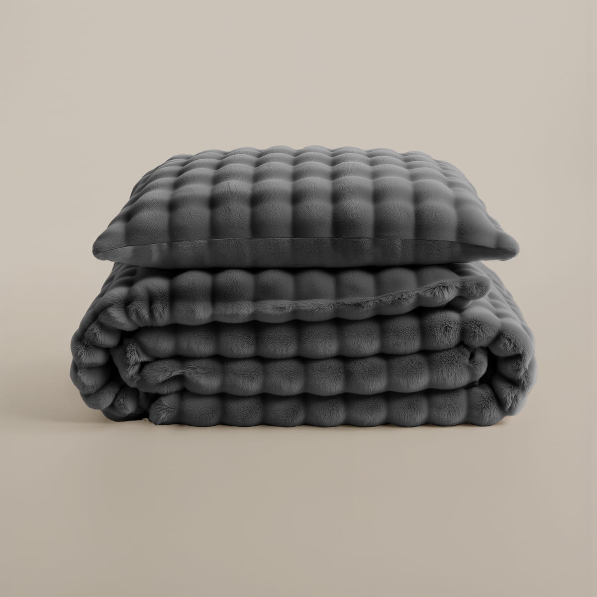 Wierzchnia strona poszwy została uszyta w 100% z pompom flanel fleece o gramaturze 280 g/m² – materiału, który natychmiast zapewnia przyjemne ciepło i aksamitne uczucie miękkości. Dzięki stylowej strukturze pomponowej całość prezentuje się nowocześnie i elegancko, nadając wnętrzu przytulny, modny charakter.