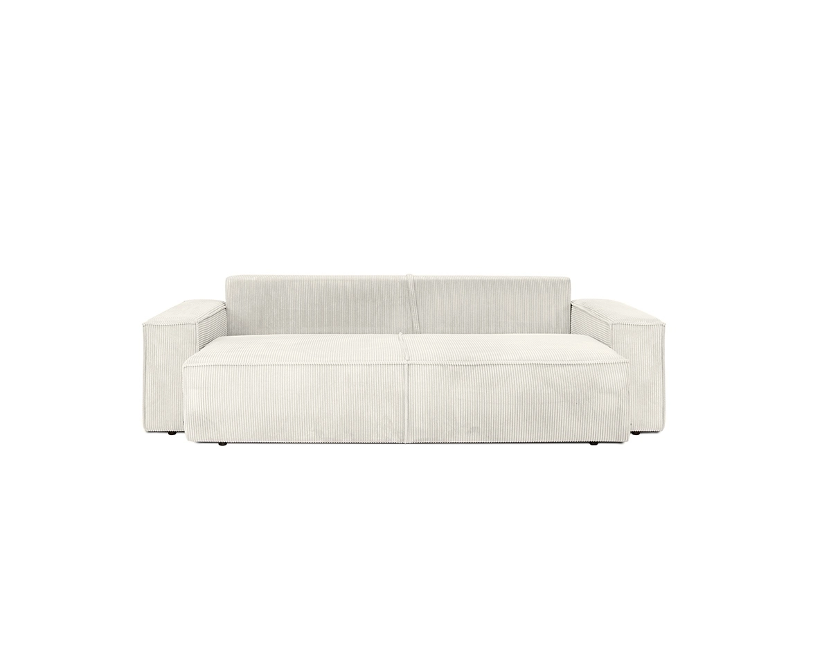 Sofa została wykończona w przyjemnej w dotyku tkaninie sztruksowej o jasnym beżowym odcieniu o nazwie Poso 38. Jest to materiał odporny na ścieranie oraz działanie światła, co sprawia, że sofa zachowa swój urok przez długi czas.